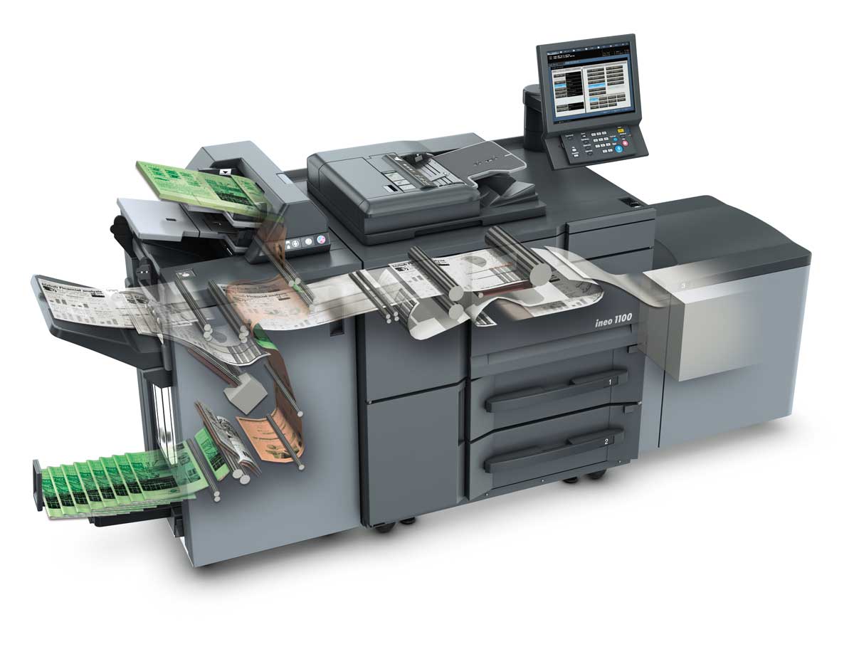 - Має максимальну віддачу 6000 pph (100 ppm) та ємність паперу до 9000 аркушів, ineo 1100 добре оснащений для виконання майже будь-якої роботи з виробництва та друку.